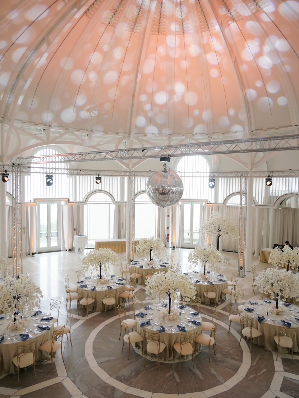 An den Tischen setzten wir Creme, Blush und Vanille ein – ein ruhiges Farbspiel, das die Architektur des Saals aufgriff.