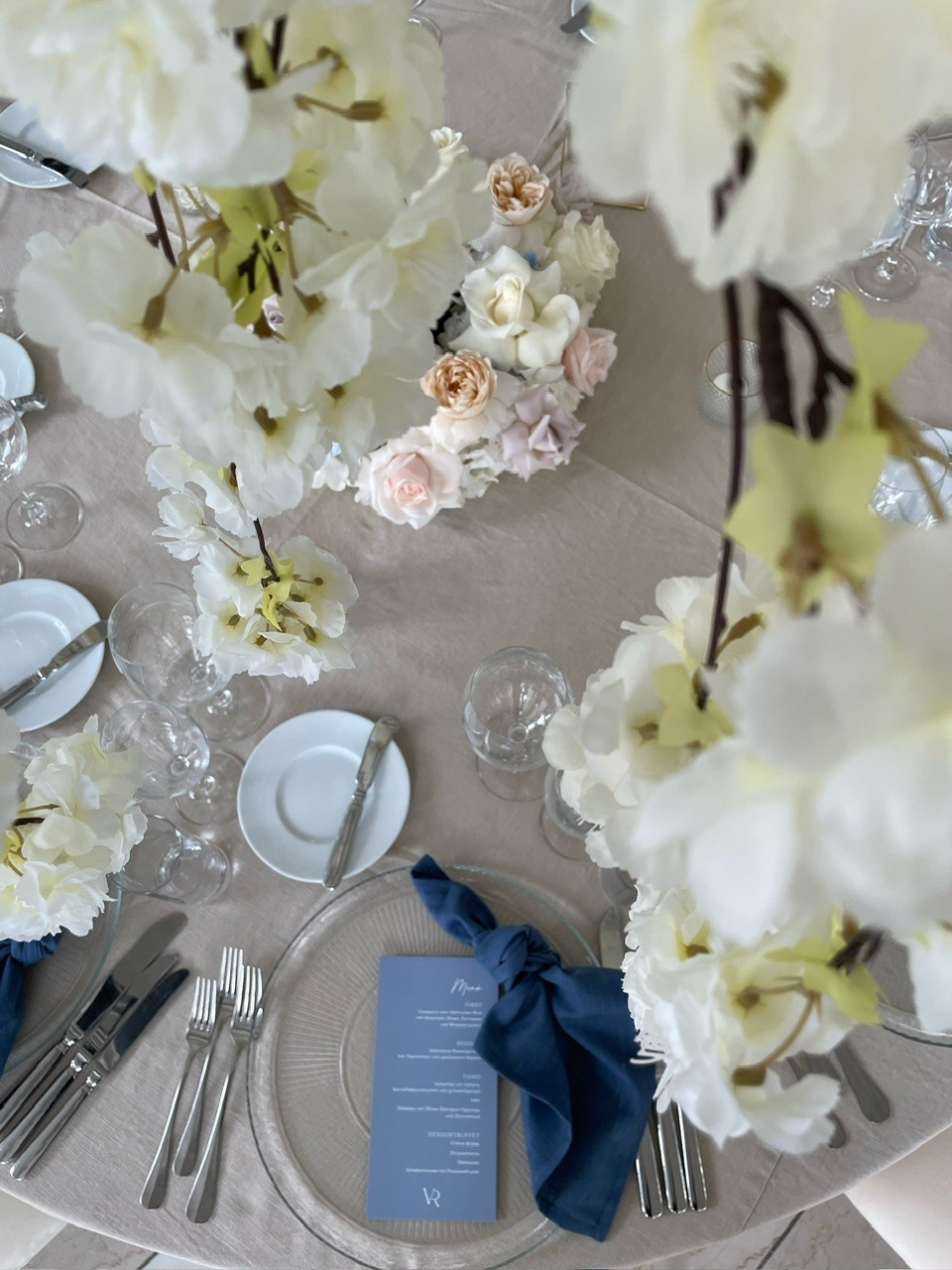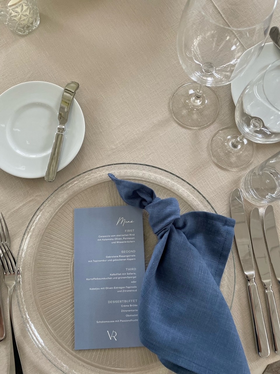 Die blau geknoteten Stoffservietten gaben dem Setting Tiefe und Eleganz. Die klare Papeterie und die Glasteller mit feiner Struktur ergänzten diesen modernen Twist.