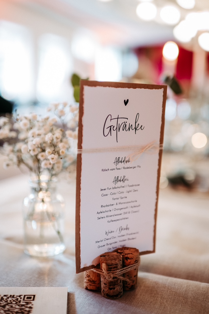 Gerade bei Hochzeiten, die auf natürliche Materialien und eine entspannte Atmosphäre setzen, fügt sich der Kartenhalter mühelos ins Gesamtbild ein. Er hält Menükarten, Getränkekarten oder Tischnummern stabil und sorgt gleichzeitig für ein kleines, charmantes Detail, das Gäste oft erst auf den zweiten Blick entdecken.